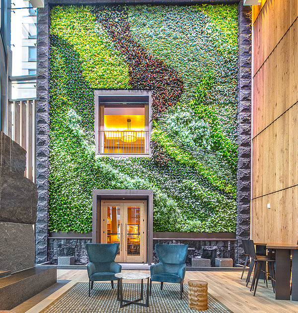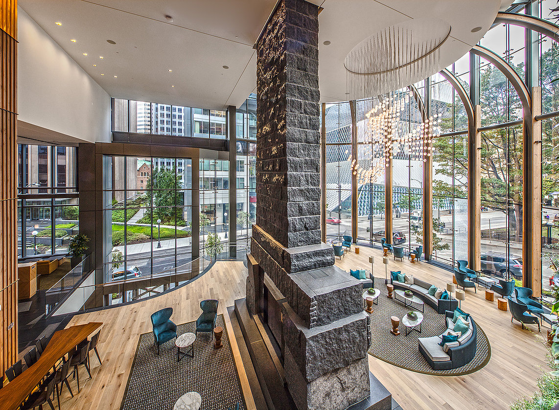 This innovative corporate campus is designed from street to sky to help tenants attract top talent and maximize productivity. An ultra-modern glass structure from the exterior, upon entering the building, you’re greeted by its signature Madison Rotunda soaring three stories from floor to ceiling. This makes for an incredibly bold first impression. Housed within the Madison Rotunda is a fireside lounge and an artistically arranged living wall comprised of 5,000 plants, welcoming guests while improving air quality, reducing noise, and relaxing visitors.