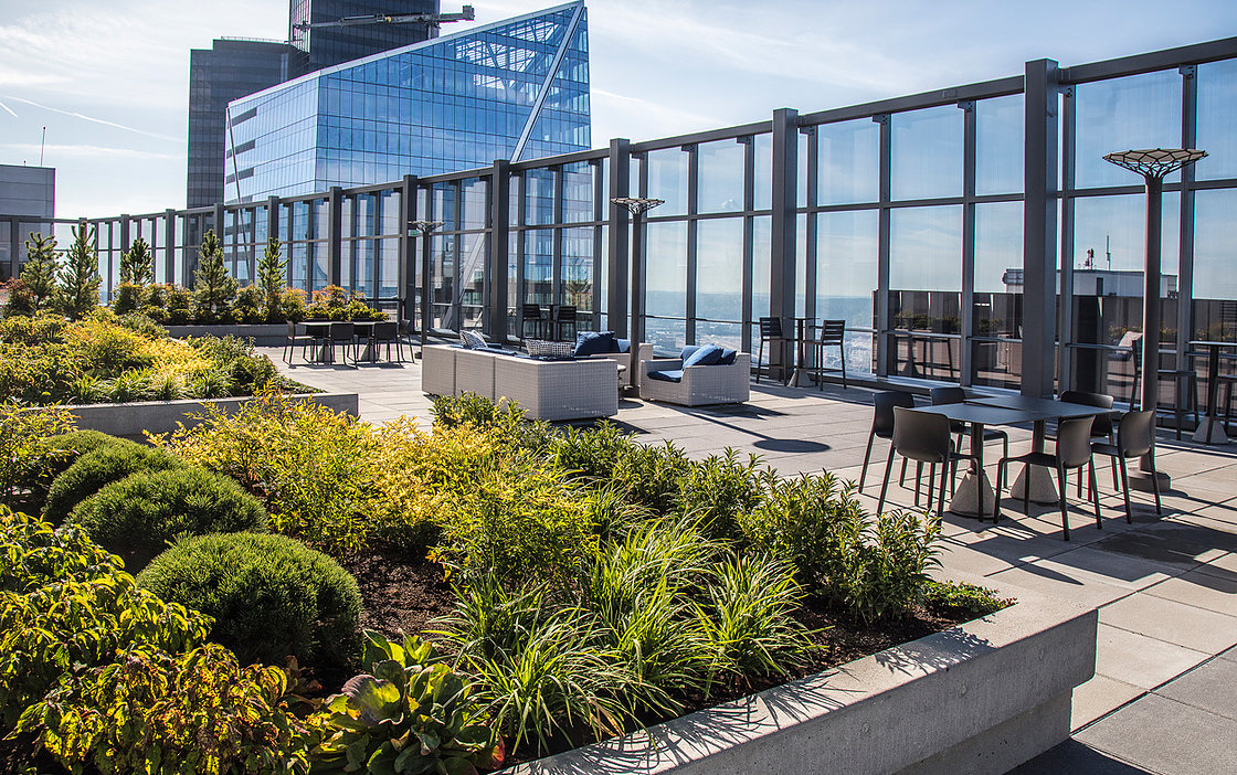 Boasting a library, 5th avenue study, private rooms, a conference/training center, and Madison boardroom with deck, one of the most eye-catching spaces within this iconic tower is the very top! Madison Centre’s rooftop terrace is truly one-of-a-kind. With its breathtaking views of Seattle, Elliot Bay, and Mount Rainier, this beautifully landscaped haven is reserved exclusively for tenants. The deck features 15-foot glass wall to shield the space from the wind and a number of designated outdoor meeting areas and quiet spaces, perfect for focus time or quiet inspiration.